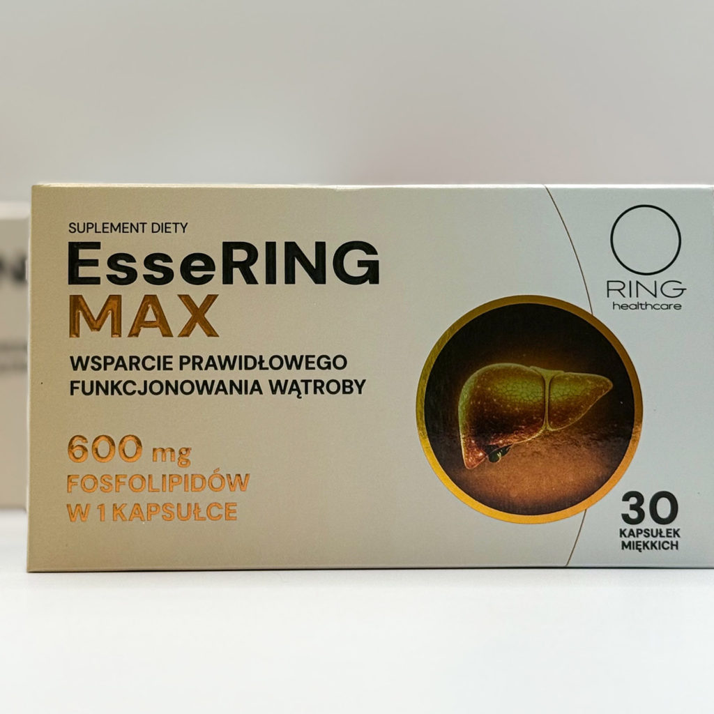 EsseRING MAX to suplement diety w postaci miękkich kapsułek, stworzony z myślą o osobach dorosłych szczególnie narażonych na szkodliwe czynniki obciążające wątrobę takich jak dieta ciężkostrawna, spożywanie alkoholu czy stosowanie leków. Kluczowym składnikiem preparatu są fosfolipidy z nasion soi (Glycine max), z wysoką zawartością fosfatydylocholiny, będącej źródłem choliny – składnika, który wspomaga prawidłowe funkcjonowanie wątroby i metabolizm tłuszczów.