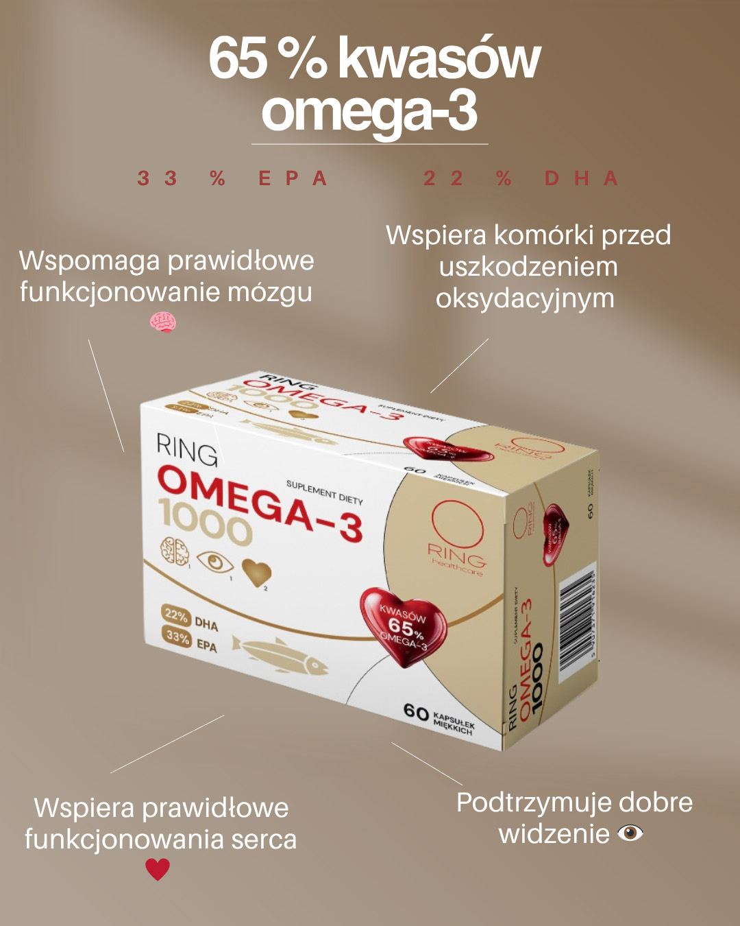 RING Omega-3 1000 mg 65% to suplement diety w formie kapsułek miękkich, uzupełniający codzienną dietę w niezbędne nienasycone kwasy tłuszczowe (NNKT). Produkt zawiera wysokogatunkowy olej rybi o wyjątkowej koncentracji: aż 65% kwasów omega-3, w tym 33% EPA (kwasu eikozapentaenowego) i 22% DHA (kwasu dokozaheksaenowego).